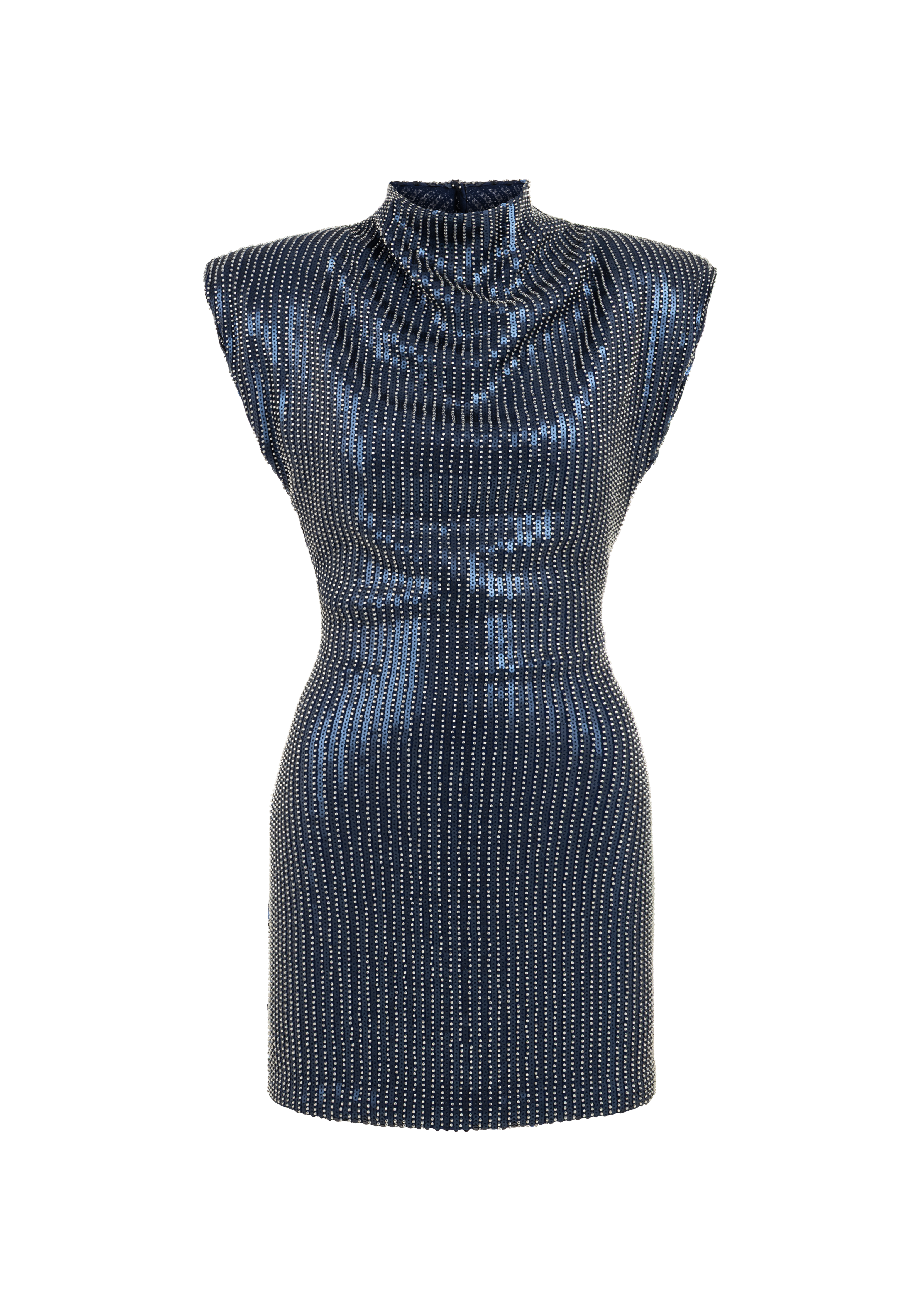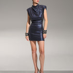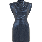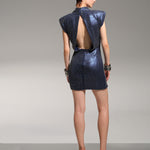 The Élodie dress combines a sleek mini cut with a subtle metallic finish that catches the light. Its structured shape creates a confident line, while the deep tone adds a touch of mystery. A modern design made for evenings where simplicity feels powerful.