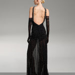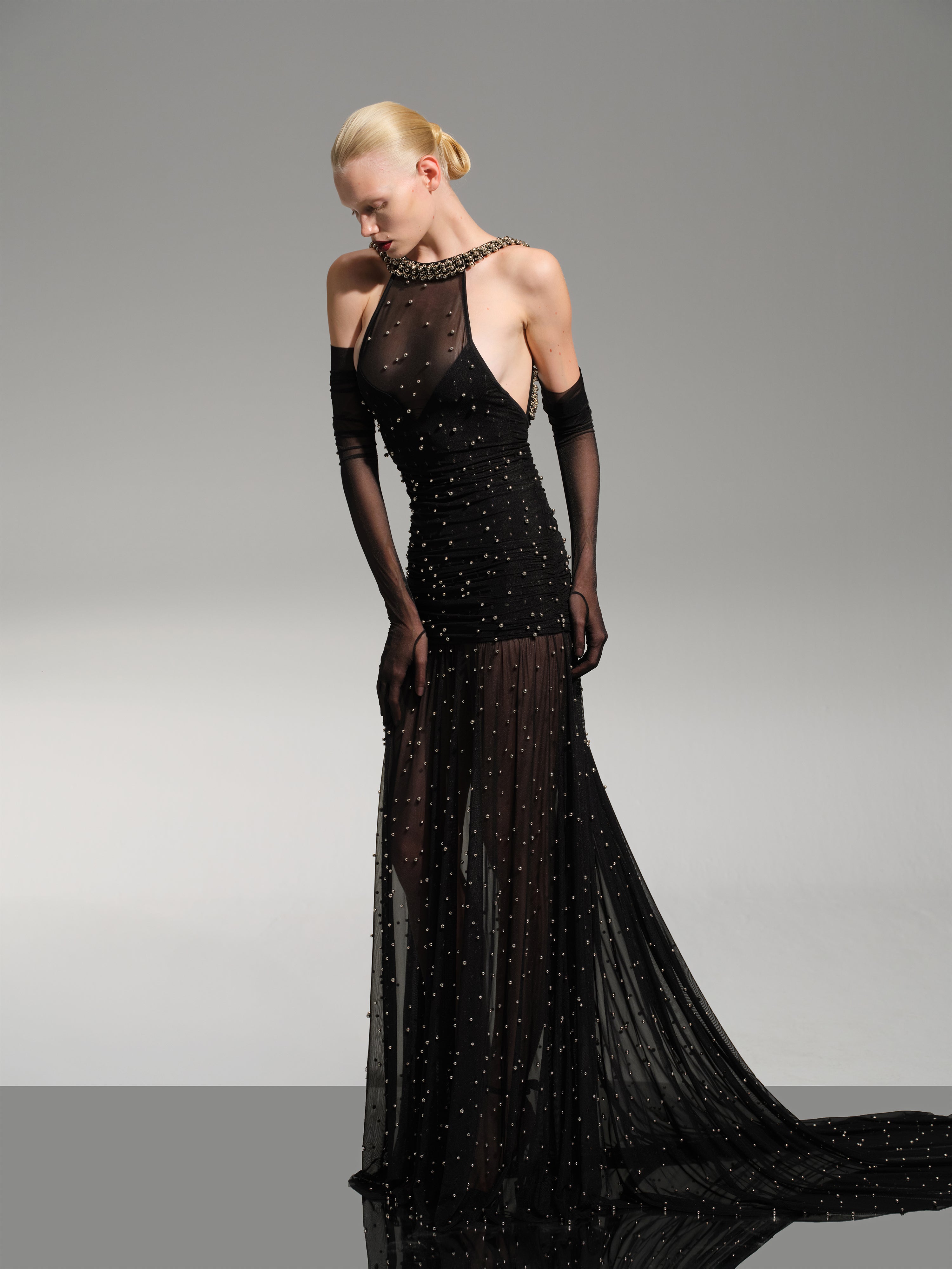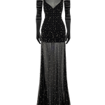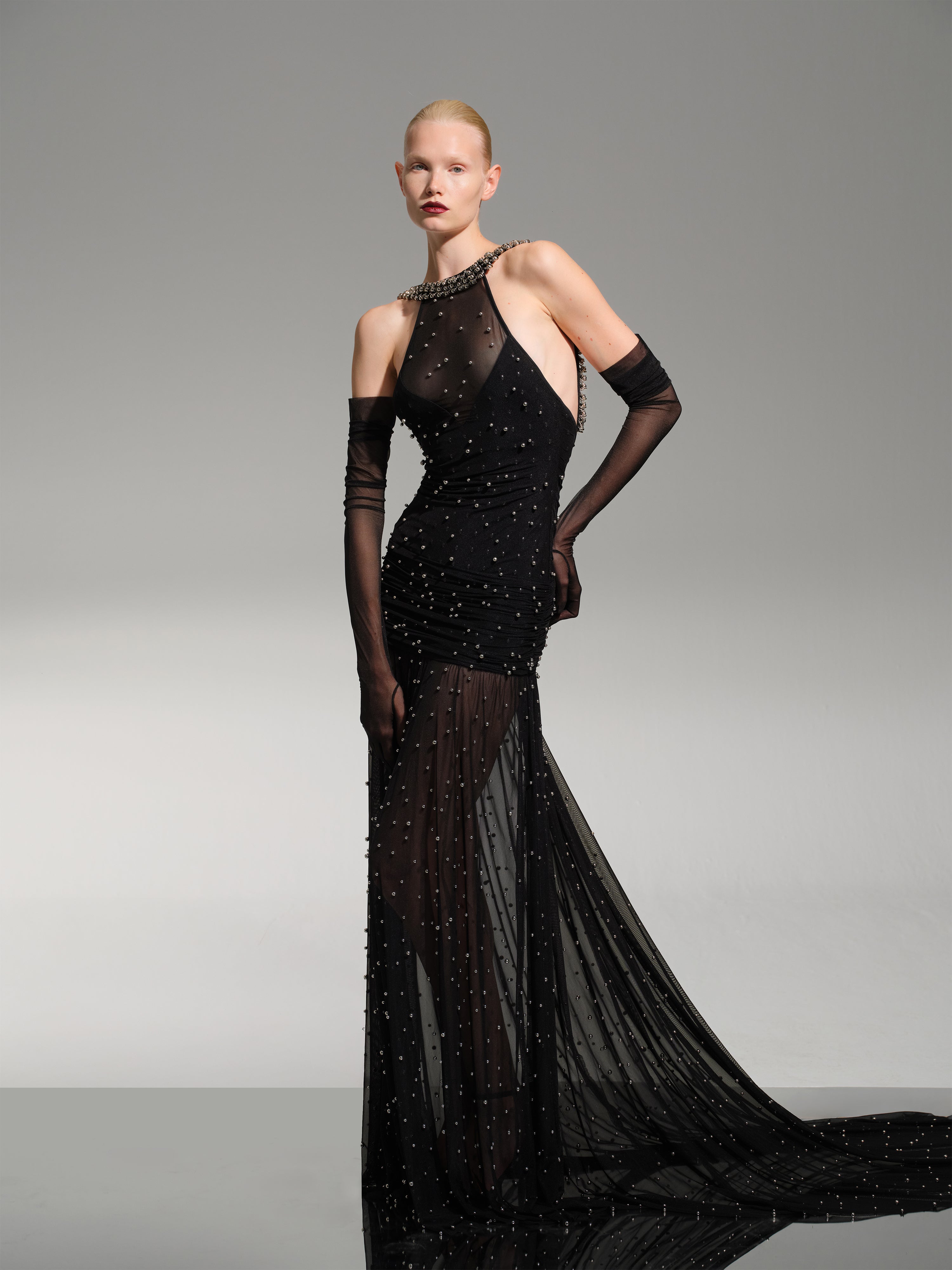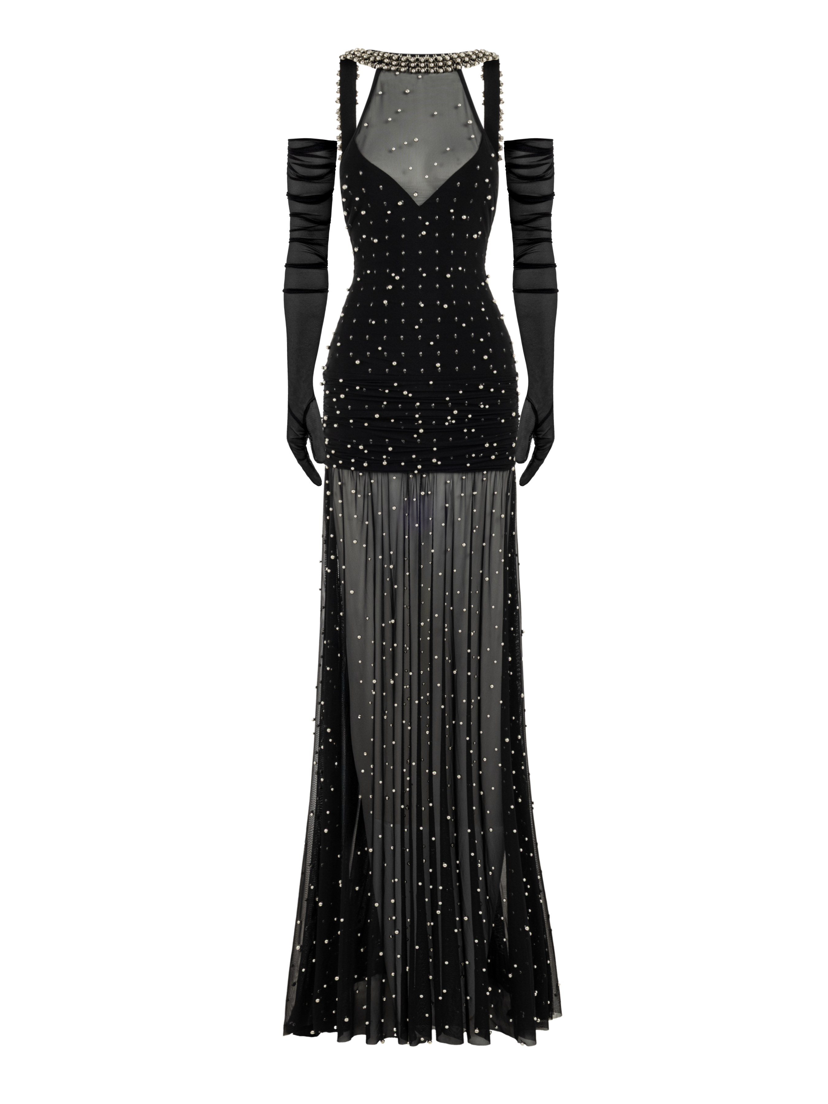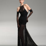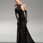 Halter Neck Sheer Embroidered Maxi Dress with Matching Gloves