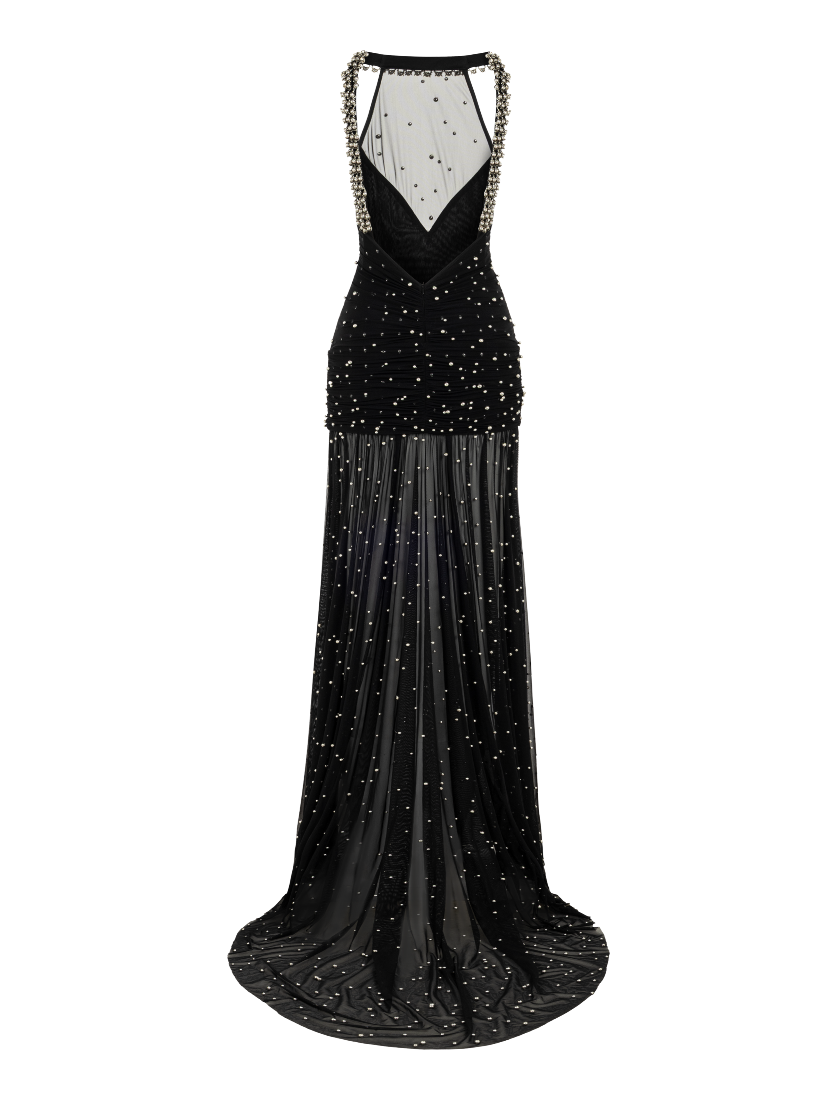 Sheer layers and delicate embellishment bring depth to this floor-length style, creating a balance of allure and elegance. The fitted bodice contrasts with fluid fabric that flows as you move. The Elsa dress is crafted for after-dark occasions where sophistication takes centre stage.