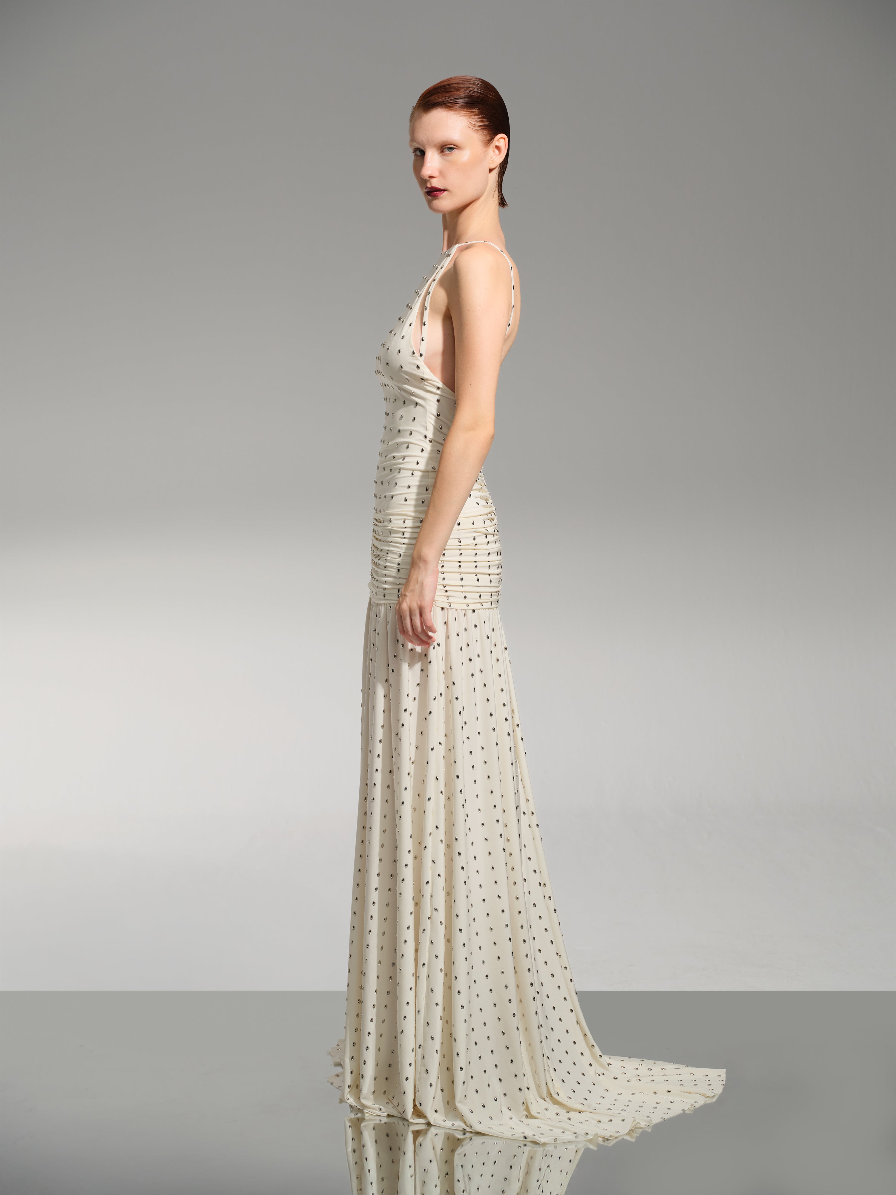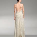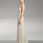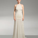 The Elsa dress captures quiet sophistication with its halter neckline and flowing length. Softly detailed fabric adds light texture, while the silhouette moves with grace. A timeless design made to bring understated elegance to evening occasions.