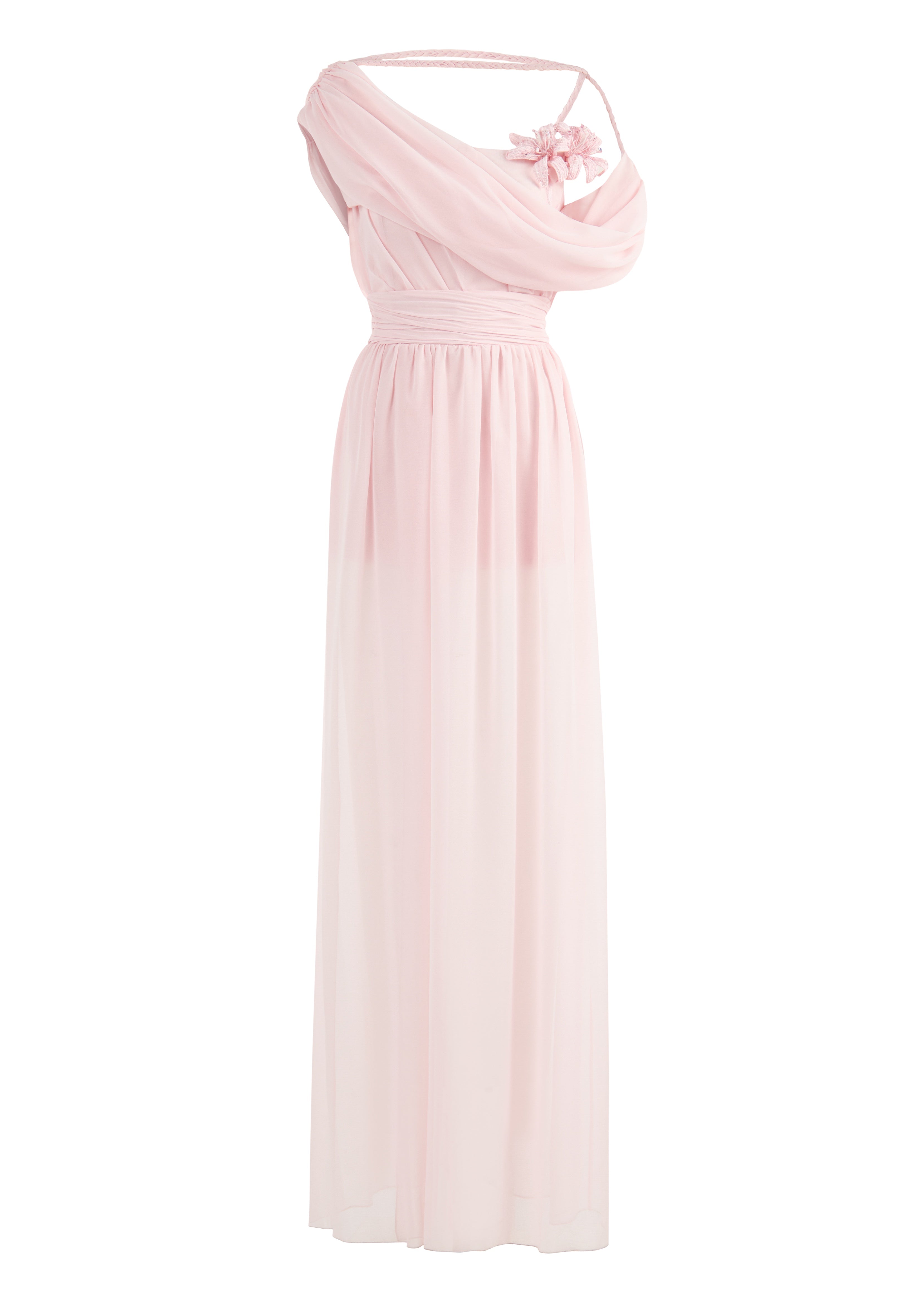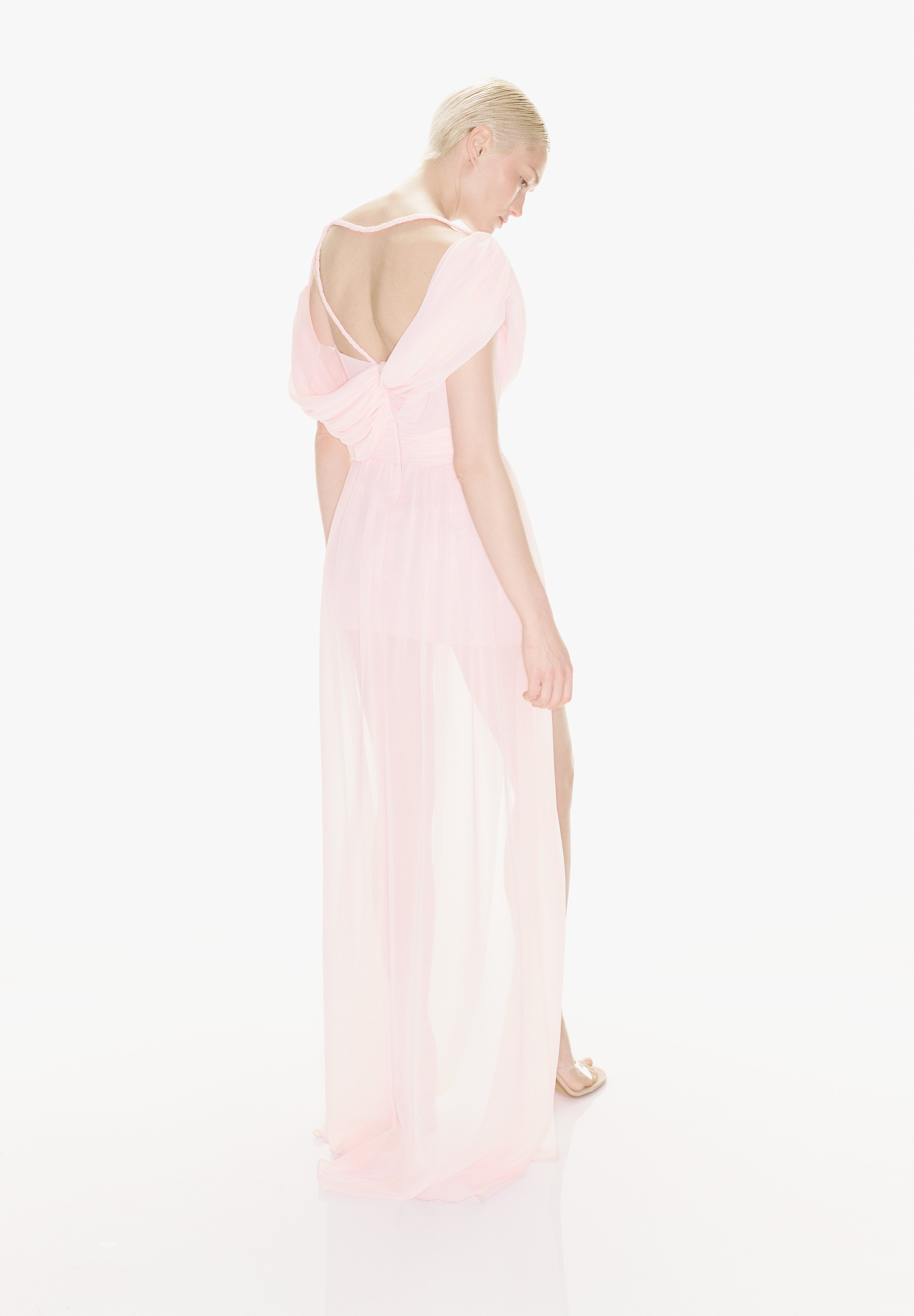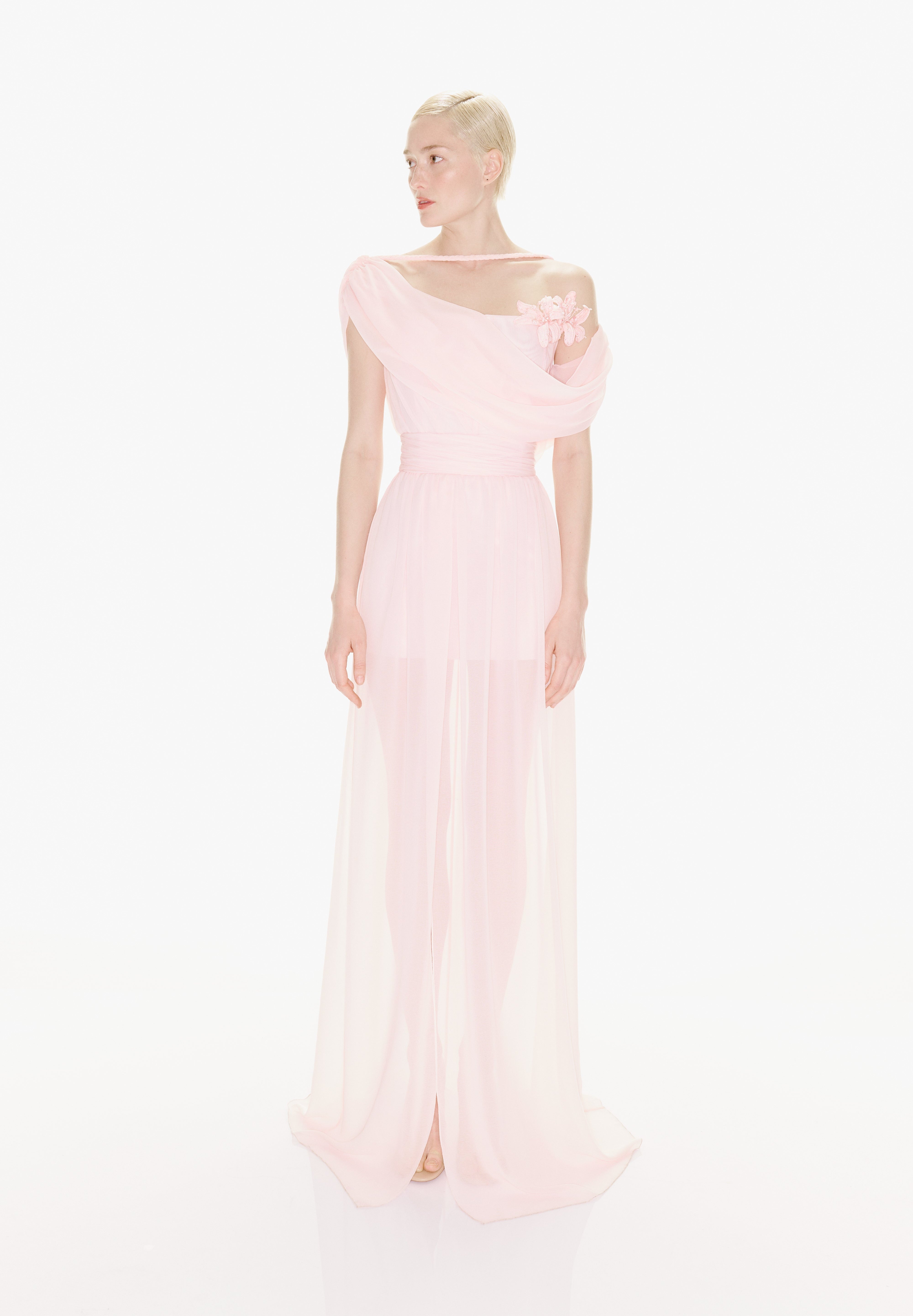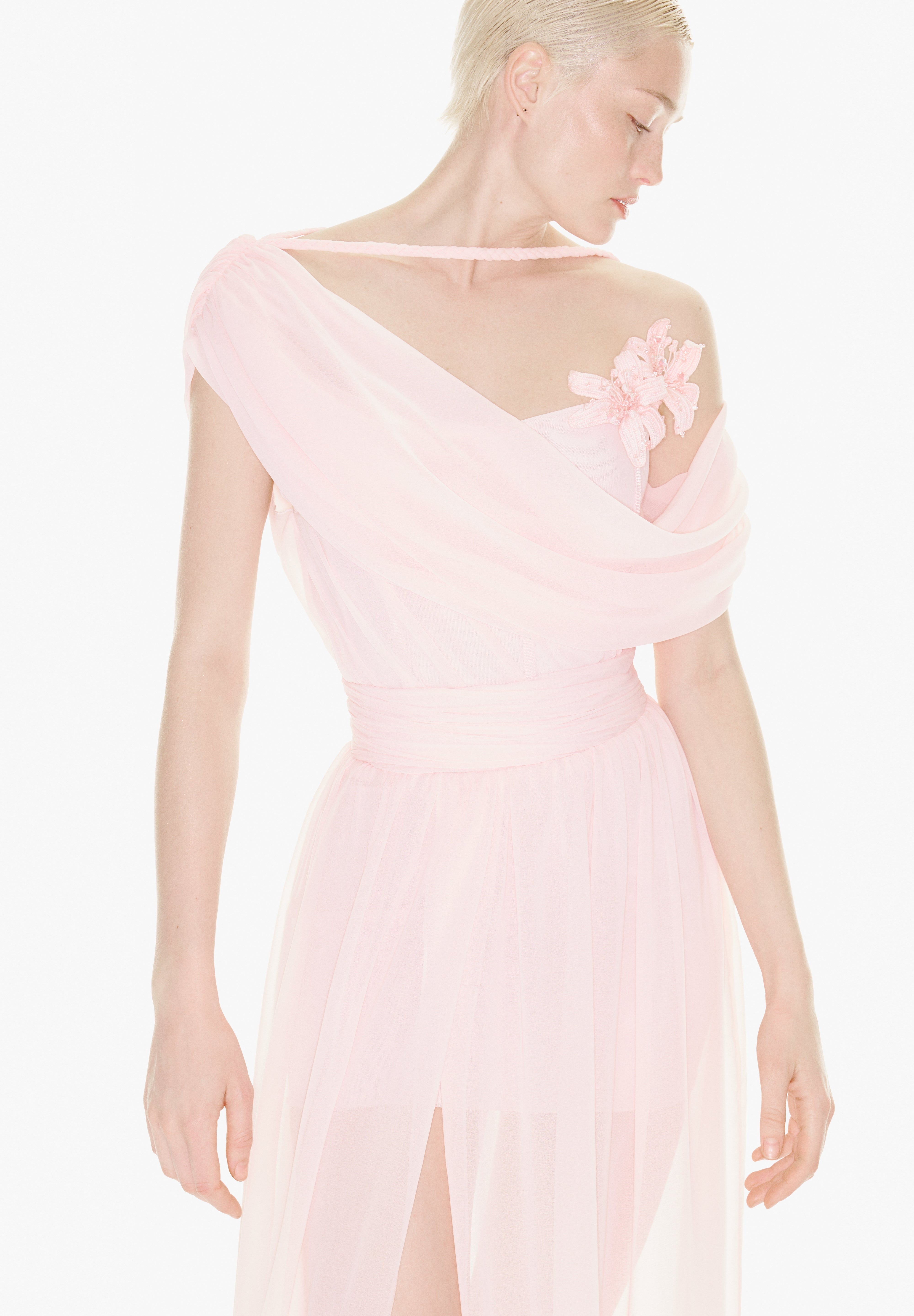 With its fairy-tale silhouette, powder pink colour and flower detail, the "Iris" dress increases the romance of summer invitations.